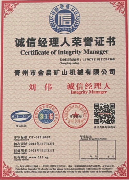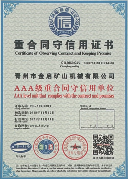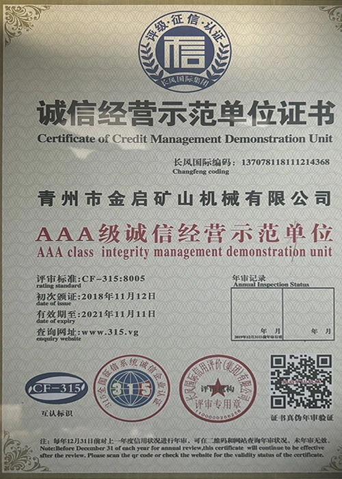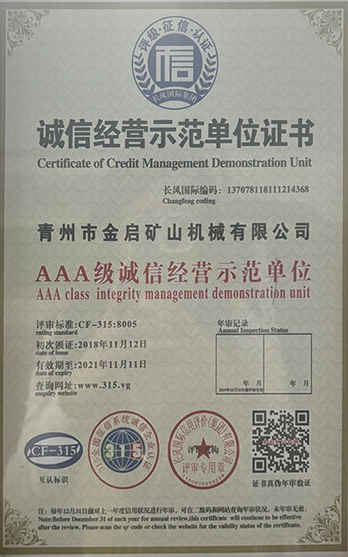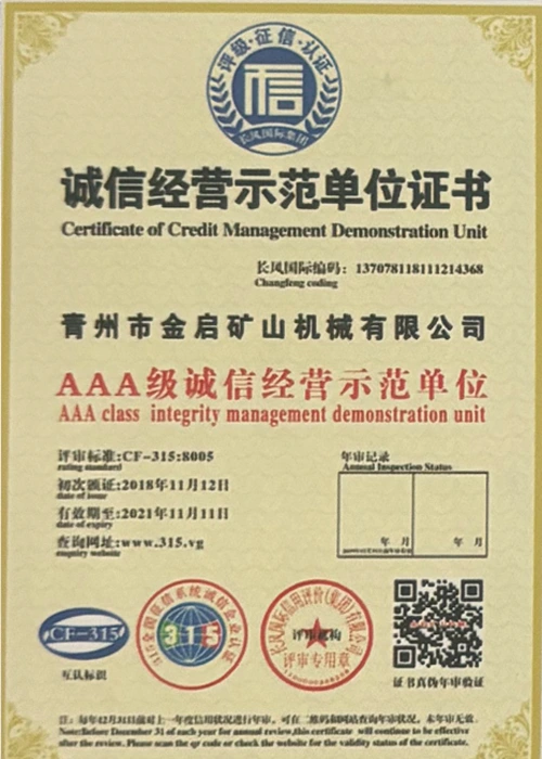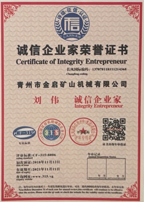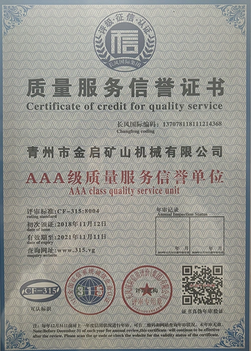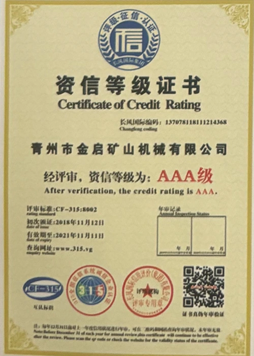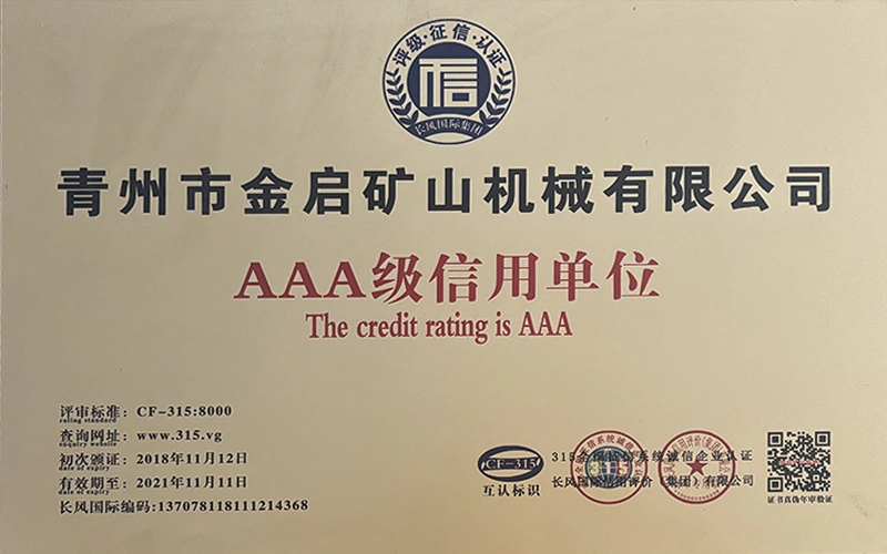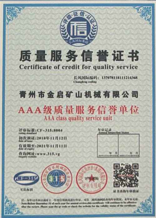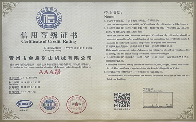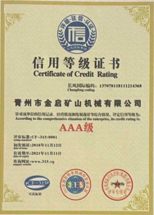 مع سنوات من الخبرة المتعمقة في الصناعة، والاعتماد على مراقبة الجودة الصارمة والابتكار التكنولوجي المستمر، حصلت الشركة على عدد من المؤهلات الرسمية والشهادات وشهادات براءات الاختراع، بما في ذلك شهادة نظام إدارة الجودة ISO، وشهادة سلامة منتجات التعدين، بالإضافة إلى براءات اختراع متعددة وبراءات اختراع نماذج المنفعة لتحسين هيكل المعدات وتحديث التكنولوجيا الموفرة للطاقة، مما يدل على القوة التقنية العميقة وضمان الإنتاج المتوافق.